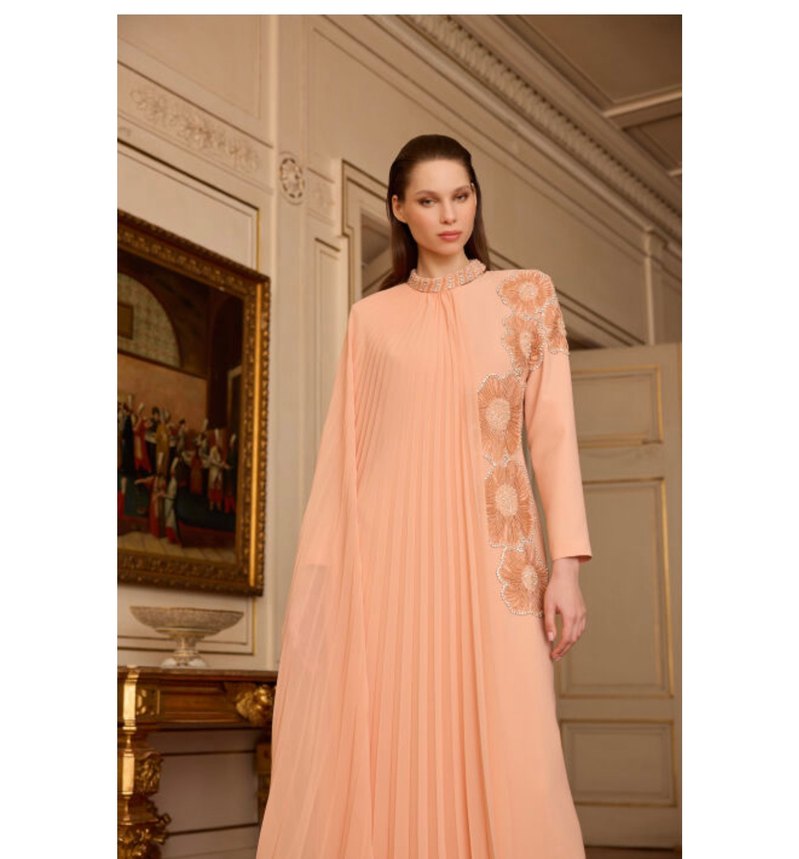 Bej renkte, yüksek yakalı, uzun kollu ve drapeli tasarıma sahip işlemeli çiçek desenli abiye elbise. Düğünler için modern klasik tarzda, klasik zarafet sunar.