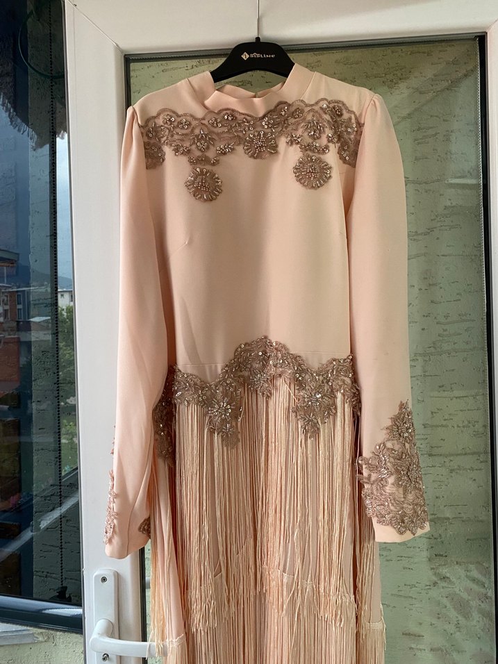 Bej İşlemeli Uzun Kollu Kadın Abiye Elbise