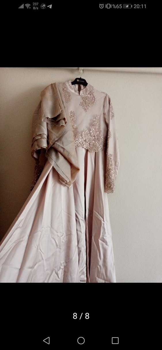 Bej renkli, uzun kollu abiye elbise, drapeli detaylara ve işlemelere sahiptir. Notch yaka ve klasik vintage tarzıyla düğünler için uygundur.