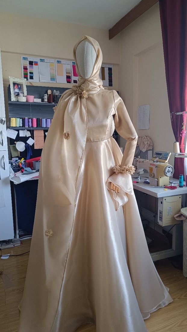 Bej renkli, yüksek yakalı ve uzun kollu bu elbise, işlemeli detayları ve drapeli tasarımıyla klasik ve zarif bir görünüm sunar. ✨