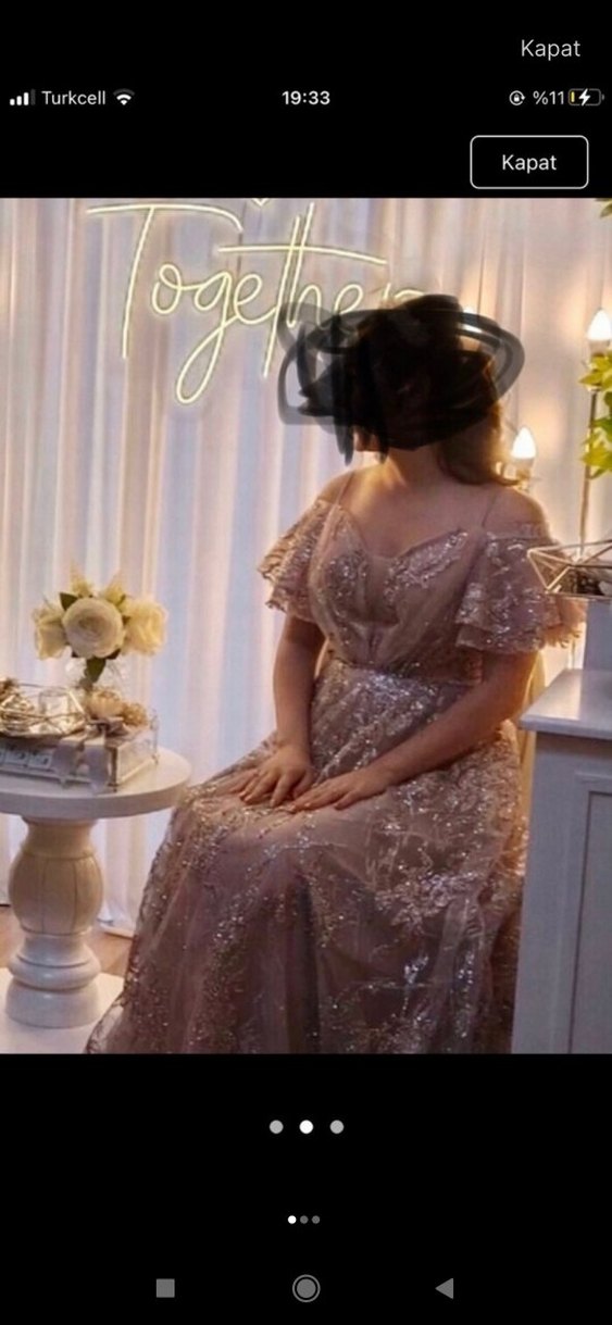 Bu bej renk işlemeli uzun abiye elbise, drapeli V yaka ve askılı kollara sahiptir. Parlak ve işlemeli deseniyle bohem şıklık sunar.