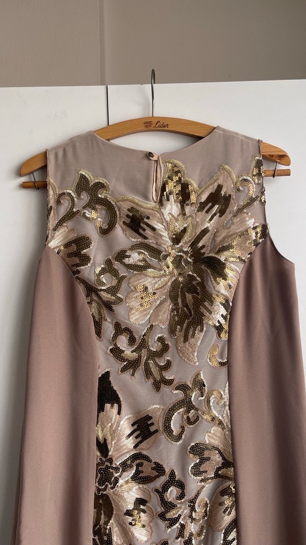Kalın askılı bej renkli, işlemeli ve drapeli detaylara sahip vintage tarzda uzun abiye elbise. Salaş kesim ve parlak dokunuşlarla düğünler için uygun. Hem tüllü kullanım saglanır , hemde tülsüz.