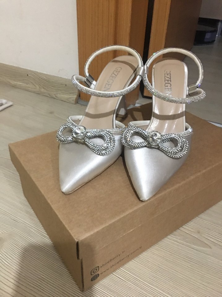 İşlemeli fiyonk detaylı, tokalı bilek kayışlı, saten bej yüksek topuklu abiye ayakkabılar. Modern klasik stil, düğünler için uygun.
