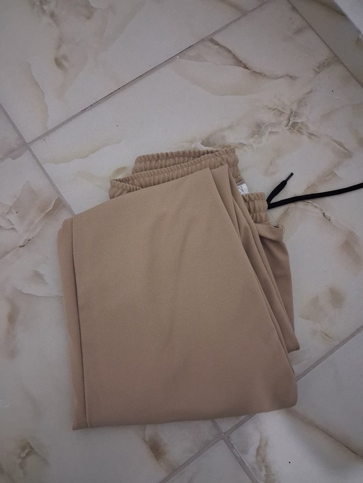 Bej renkli, düzenli kesim ve normal midi boyda kadın kumaş pantolon. Düz ve minimalist tasarımıyla günlük kullanıma uygundur. ✨