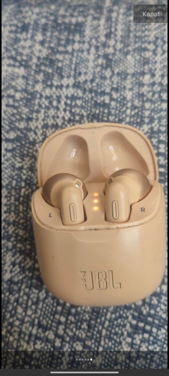 Bej renkli JBL kablosuz kulaklıklar, kompakt şarj kutusuyla birlikte. Hafif renk ve ergonomik tasarım rahat kullanım sağlar .