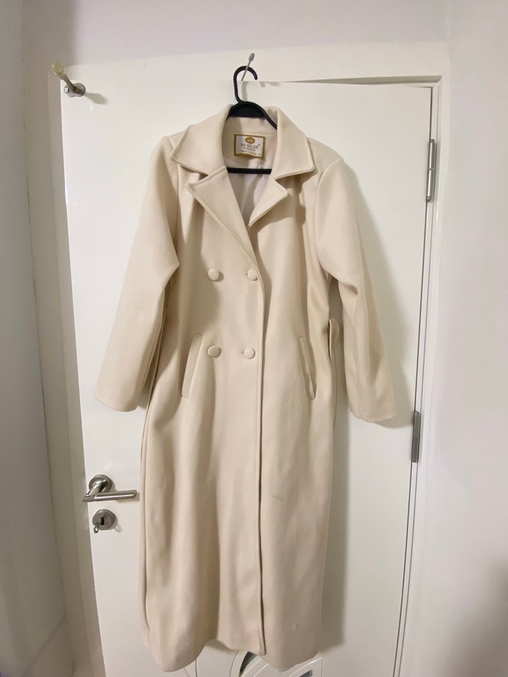 Düğmeli ön kısmı ve kesimli yaka detayına sahip uzun beyaz kadın kaban. Uzun kollu ve rahat kesimdir, yumuşak ve sıcak kumaştandır. Günlük kullanıma uygundur. Kaşedir çok güzel bir ürün hiç giyilmedi kullanılmadı yepyeni bi ürün