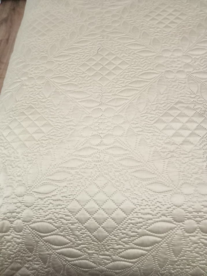 bej yatak örtüsü, kabartmalı çiçek ve geometrik desenlerle dokulu, sade ve şık görünüme sahip.