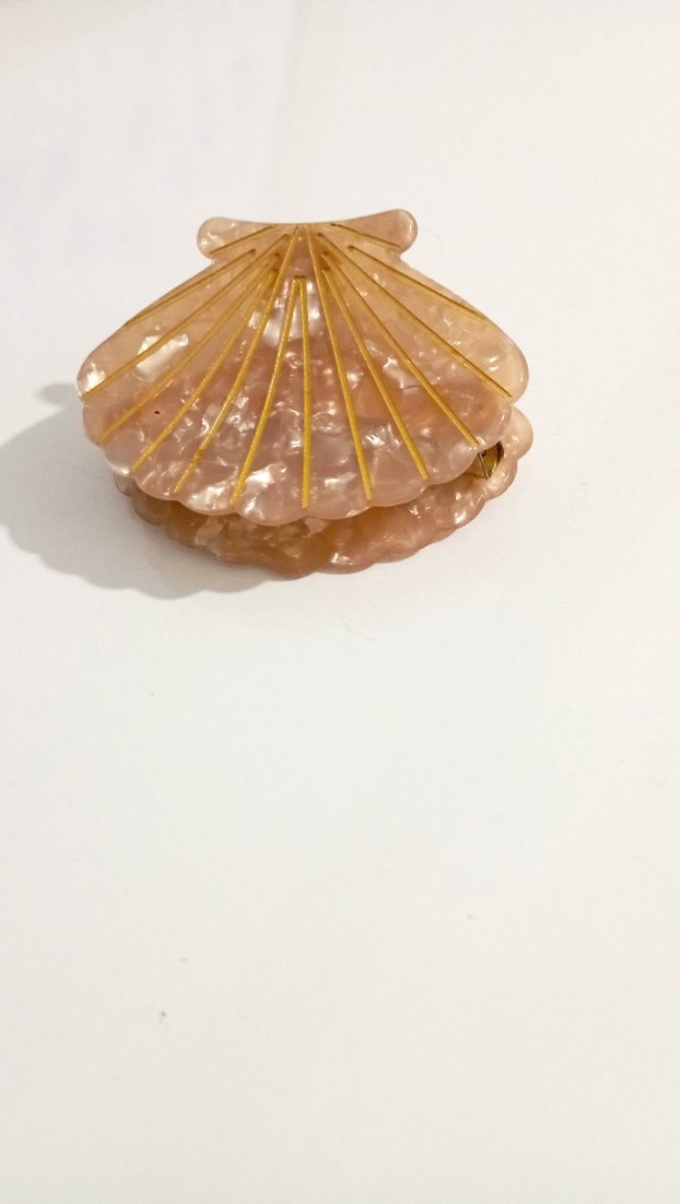 Plastikten yapılmış, bej renkli ve kabuk desenli pilili saç tokası, hafif tonlu ve bohem tarzda.