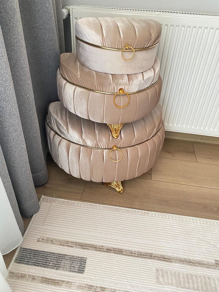 Bej kadife kumaştan yapılmış, altın detaylı ve ayaklı üçlü yuvarlak çeyiz sandığı