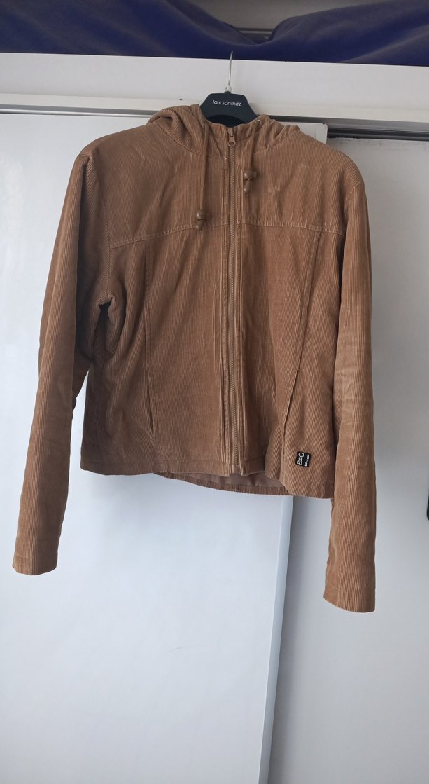 Bej kadifekumaştan, uzun kollu ve fermuarlı, kadın ceket. günlük rahat stil için uygun. içi kalın elyaflı kış için ideal.