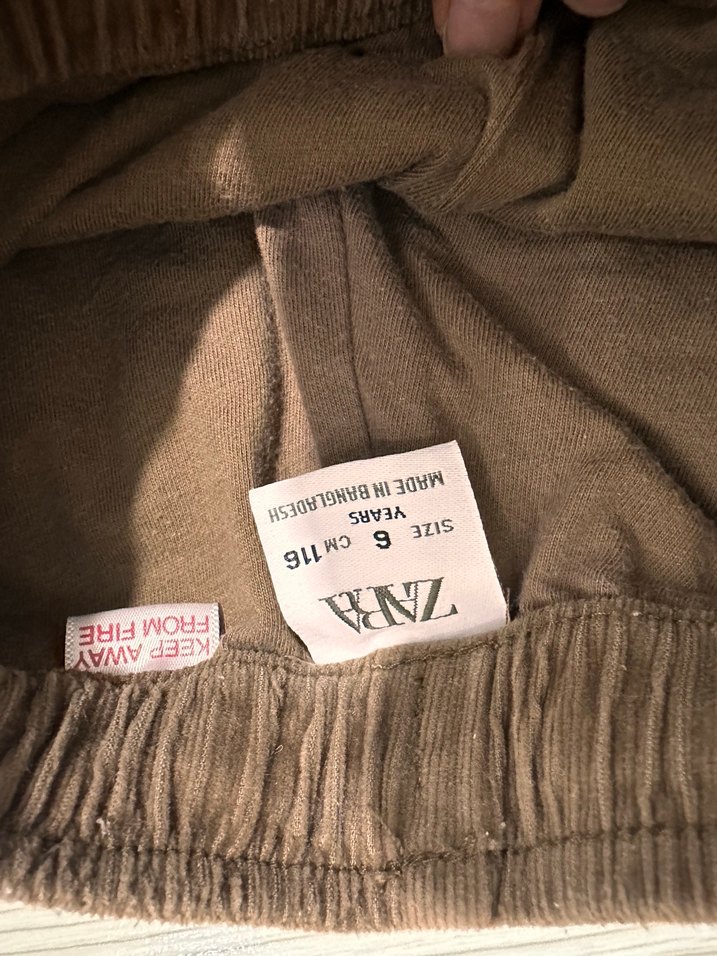 Zara markalı, 6 yaş için uygun, Bangladeş üretimi bej kadife erkek pantolon. Rahat ve konforlu, lastikli bel detaylı.
