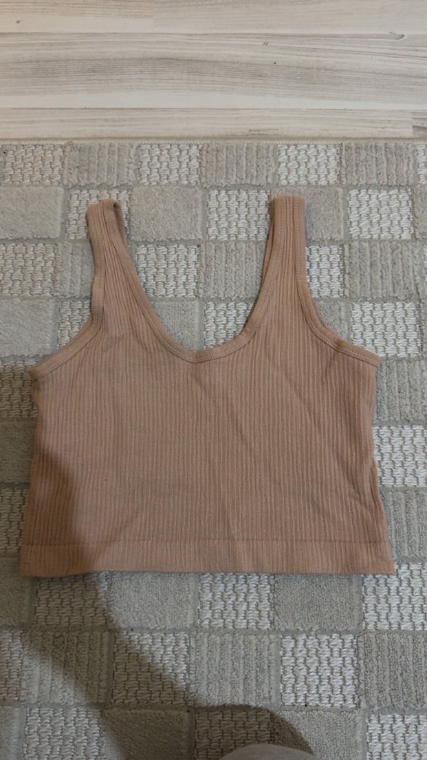 Bej renkli, askısız triko crop top, vücuda oturan kesimi ve normal boyuyla günlük kullanıma uygundur.