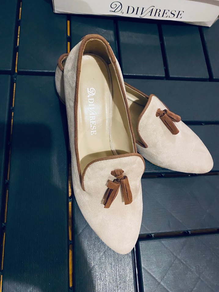 Bej süet malzemeden üretilmiş, püsküllü klasik kadın ayakkabısı. Blok topuklu ve konvansiyonel tarzda, günlük kullanıma uygundur. D.DIVARESE markalı.