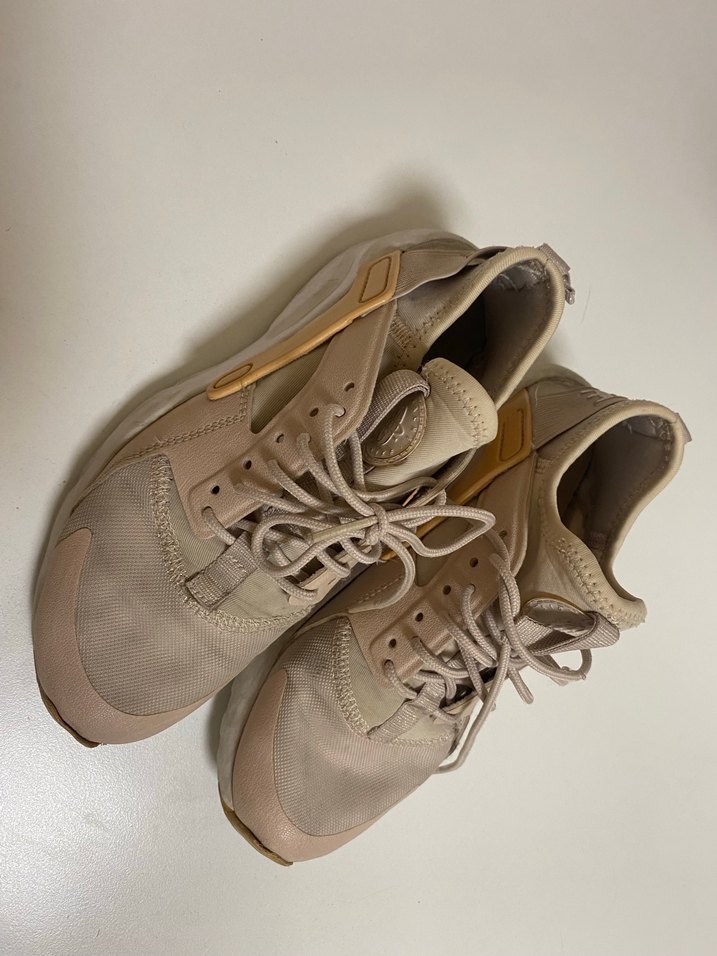 Bej renk, bağcıklı ve dolgu topuklu kadın spor ayakkabısı. Kauçuk malzemeden, günlük sokak stili için uygun, pastel tonlarda. Spor salonunda giyildi kusurları fotoğraf da var