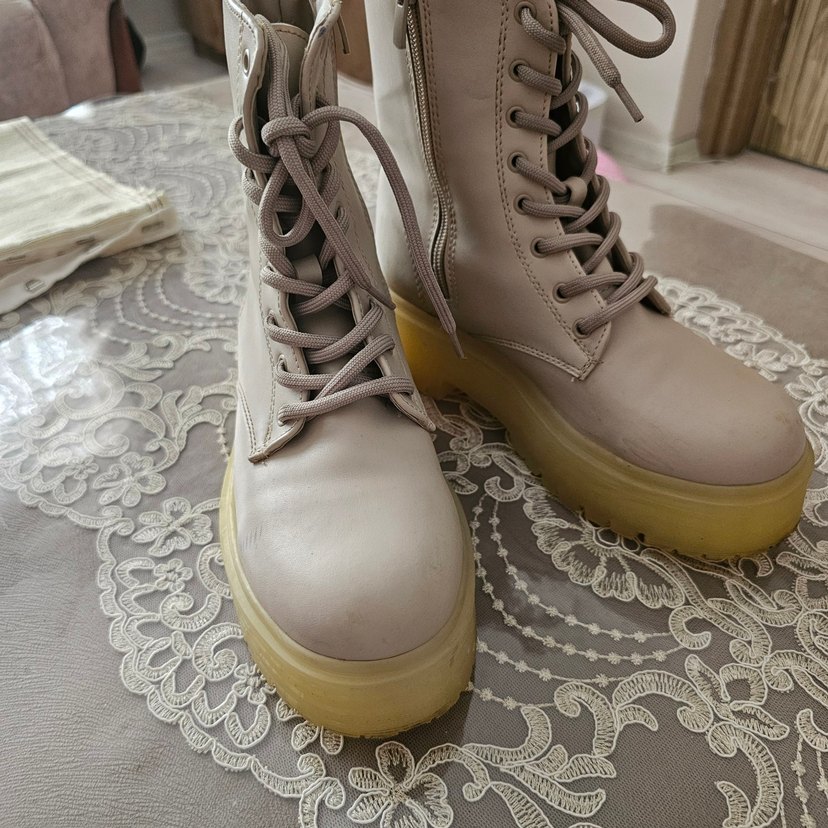 Bej bağcıklı kadın botları, platform kauçuk topuklu ve gri tonlu. Sokak stiline uygun gündelik rahatlık sunar.