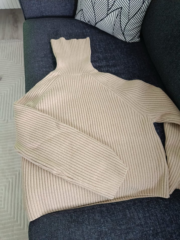 Bej renk, balıkçı yaka, uzun kollu, vücuda oturan örme triko kazak. Rahat ve gündelik kullanıma uygun tarzda.
