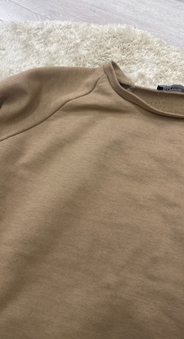 Bej renkli, yuvarlak yakalı ve uzun kollu kadın sweatshirtü. Yumuşak keten kumaştan üretilmiş, bol kesim ve desensiz sade tasarıma sahip, rahat bir günlük kıyafet.