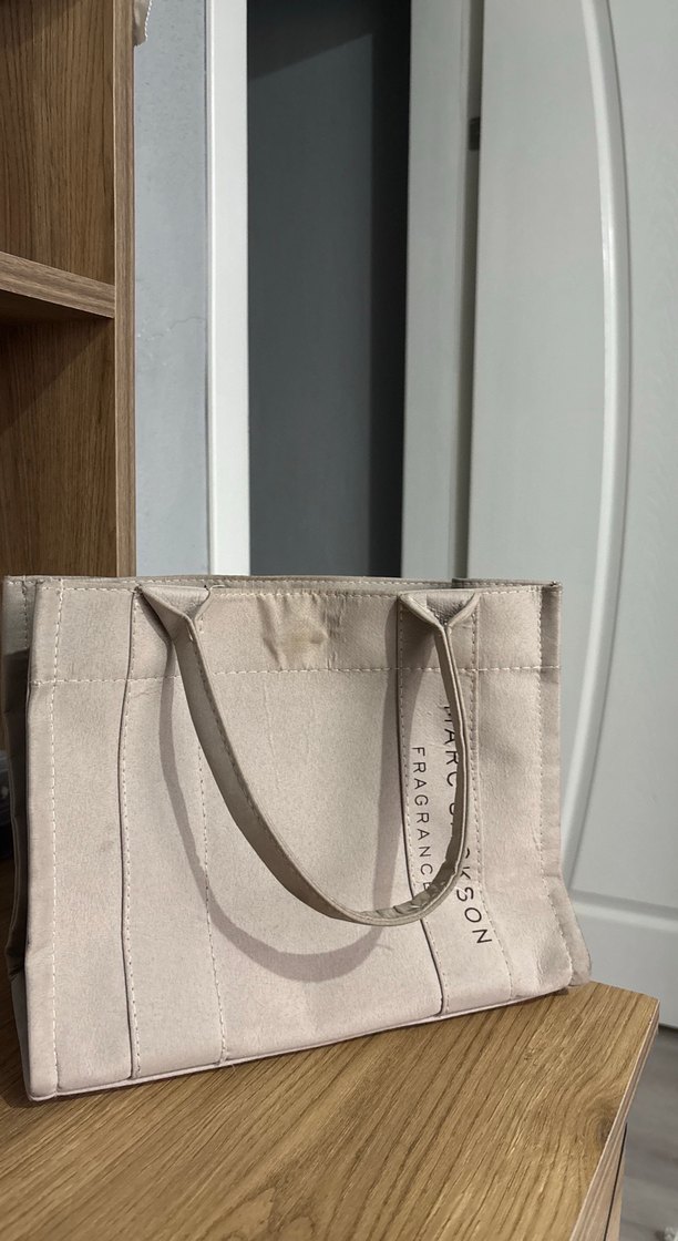 Bej renkte, baskılı ve yumuşak sentetik kumaştan yapılmış kadın çantası. Paris tarzı, rahat normcore stilinde ve 'FRAGRAN' yazılı detaylara sahip.