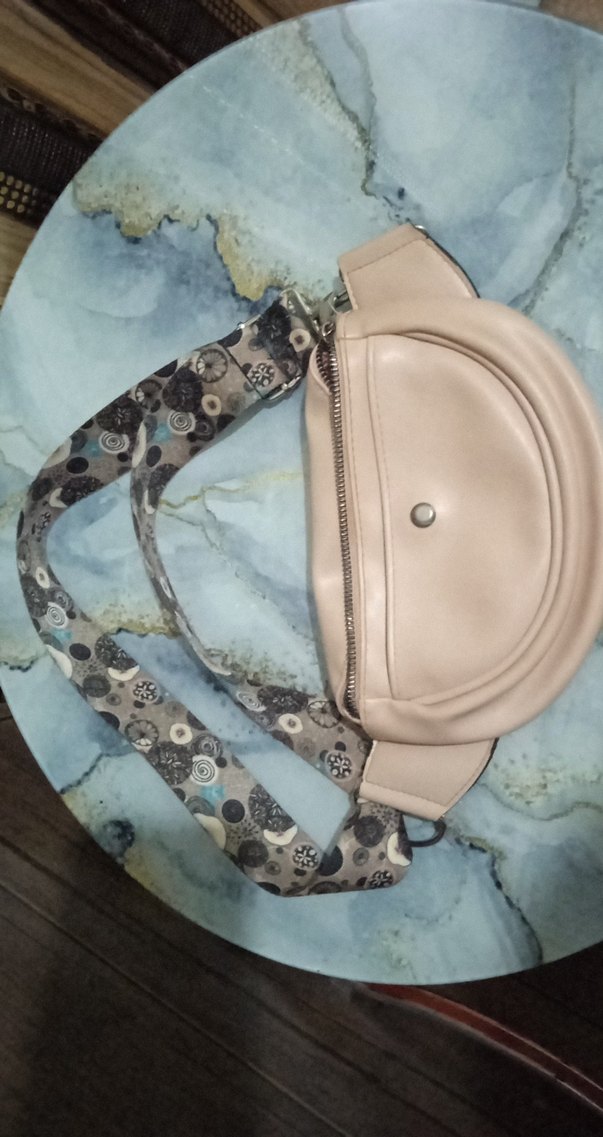 Bej renkte, kemerli tasarıma sahip kadın bel çantası. Yumuşak sentetik malzemeden üretilmiş, desenli kumaş askıya sahip. Günlük sokak stiline uygun.