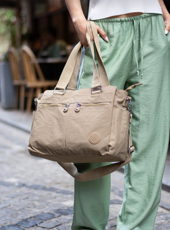 Sentetik kumaştan yapılmış, bel detaylı bej çapraz çanta. Günlük kullanım için çok gözlü fermuarlı ceplere sahip, rahat sokak stiline uygun. su geçirmez sanmoris marka