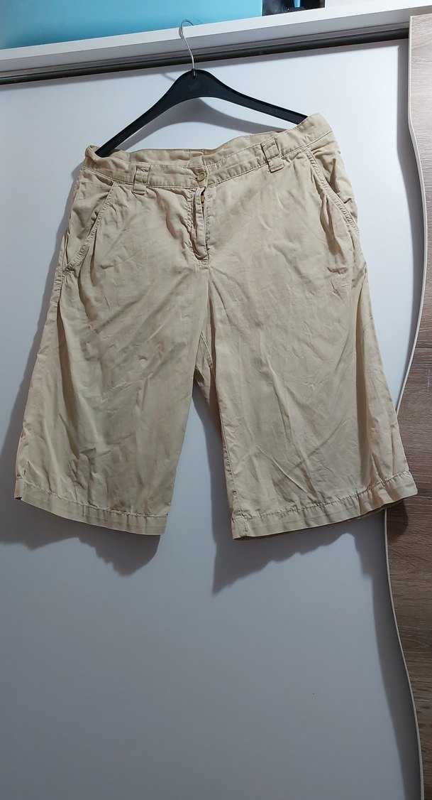Açık bej renkli, bol kesim ve kısa boyda kadın Bermuda şort. Rahat ve şık, günlük sokak stili için uygundur.