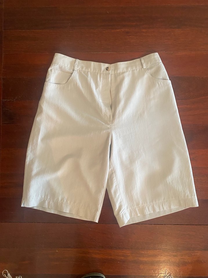 Bej renkli, keten kumaştan yapılmış, bol kesim kadın bermuda şort, rahat sokak stili ve günlük kullanım için uygundur. Kumaşı yumuşak ince dökümlü
