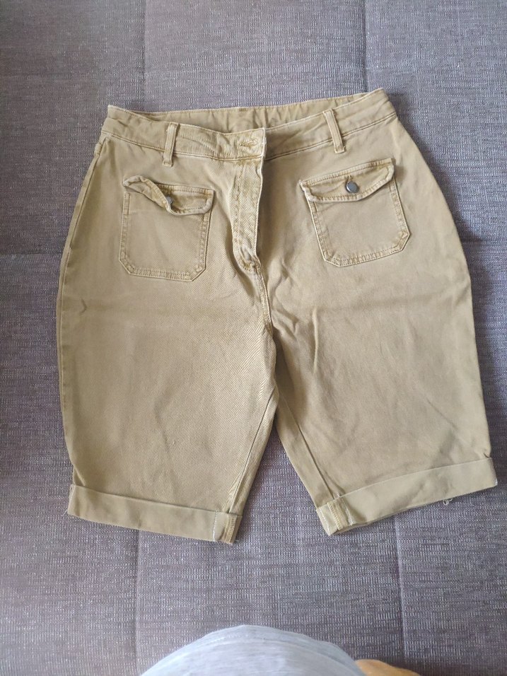Bej renkli, rahat kesim ve kısa boyda kadın bermuda şort. Yumuşak keten kumaştan üretilmiş olup günlük rahat .L. .xl bedene uyumlu 1 kez giyildi