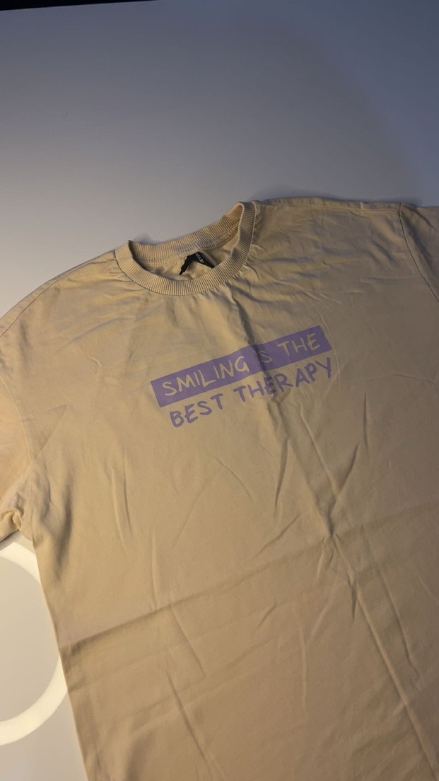 Bej renkli, kısa kollu ve bisiklet yaka kadın tişörtü, "Smiling is the best therapy" baskılıdır. Rahat kesimi ve ipeksi kumaşı ile şık ve rahat bir görünüm sunar. . Detaylı bilgi için mesaj atabilirsiniz