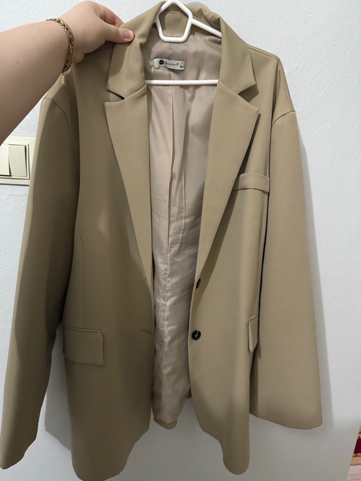 Bej midi uzunlukta kadın blazer ceket, keskin yaka ve uzun kolludur. Düğmeli ve rahat kesim olup, ofis ve günlük kullanıma uygundur. Sentetik kumaştan üretilmiştir.