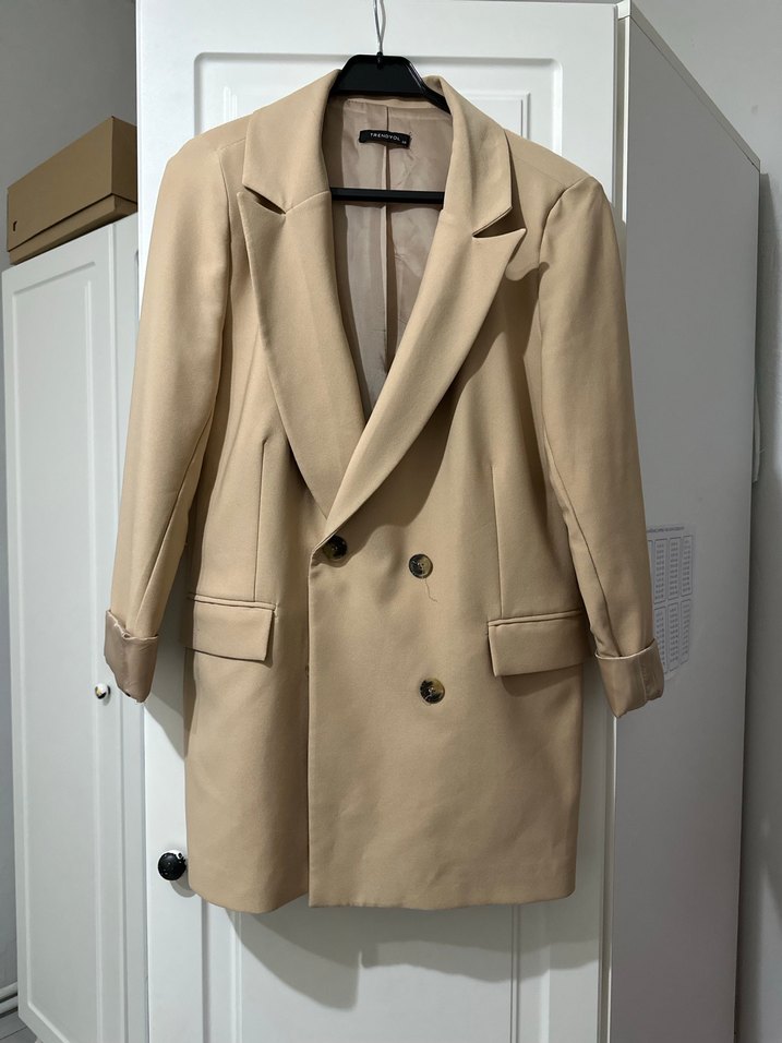 Bej renkli, düğmeli ve kadın blazer ceket. Uzun kollu, normal kesim ve klasik şıklıkta, ofis için uygun. Trendyolmilla markadır. M beden.