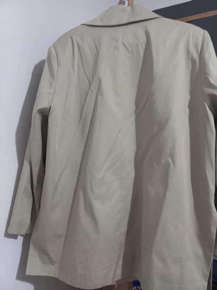 Bej renkte, düğmeli, normal kesimde midi uzunlukta kadın blazer cekwt Uzun kollu ve notched yaka detaylı, sentetik kumaştan üretilmiştir.