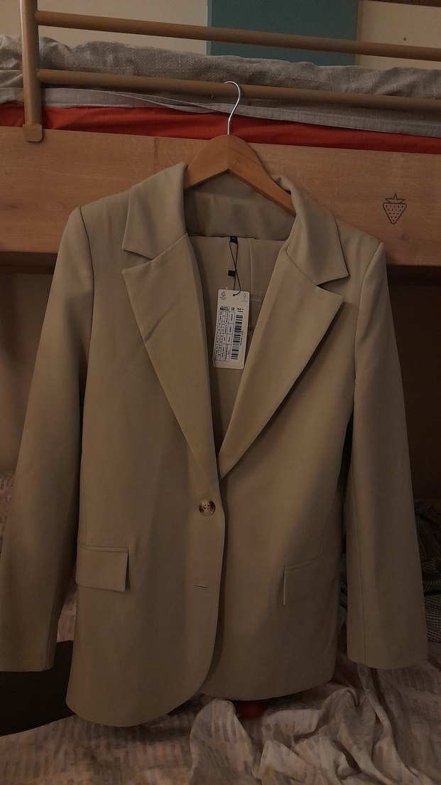 Bej renkli, yakalı ve düğmeli kadın blazer. Uzun kollu, normal kesim ve ofis şıklığı için uygun. Sentetik kumaştan yapılmıştır. Ceket 38 pantolon 40 beden.