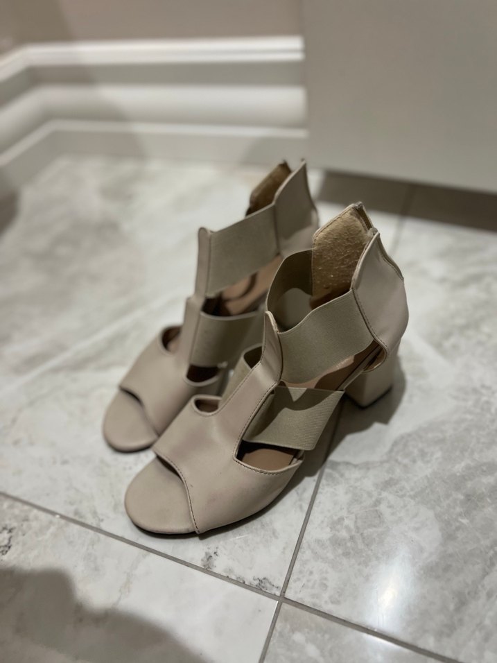 Bej renkli, blok topuklu kadın akşam ayakkabısı. Tokalı tasarımı ve kauçuk malzemesi ile modern, minimalist bir tarz sunar.