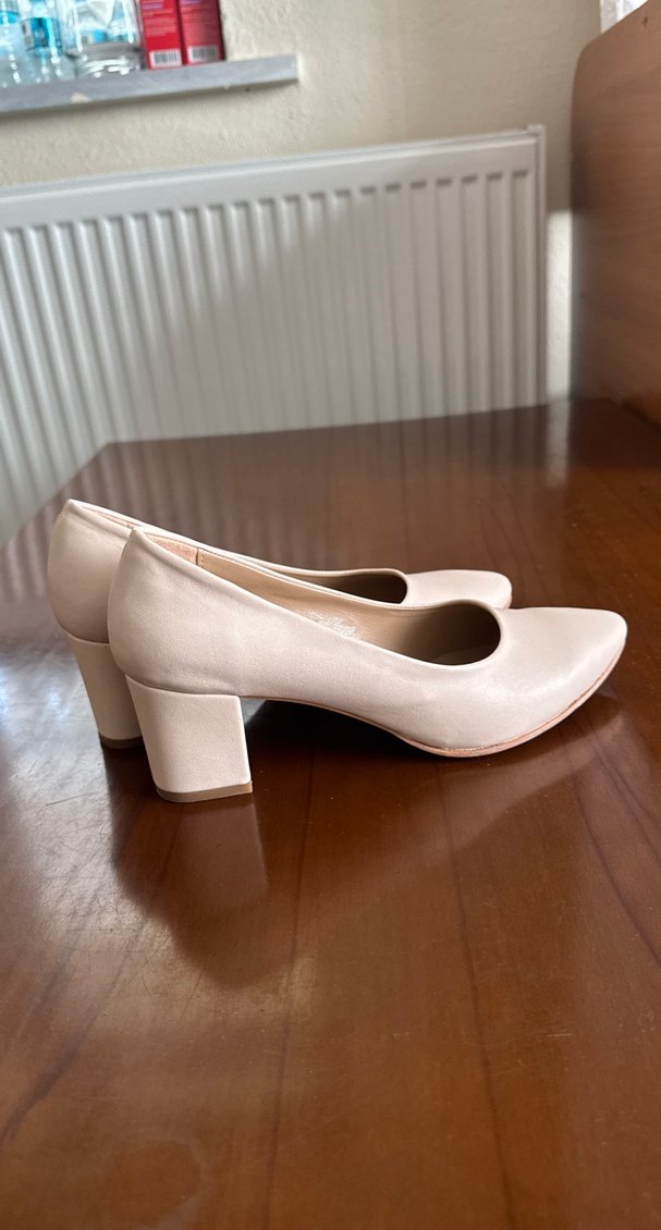 39 numara Bej renkte, blok topuklu kadın stilettolar. Modern klasik tarzda, ofis için uygun ve zahmetsiz şıklık sunar. Pastel ton ve desensiz tasarım minimalizmle uyumlu. Sıkıntısı yok bir kez giyildi.
