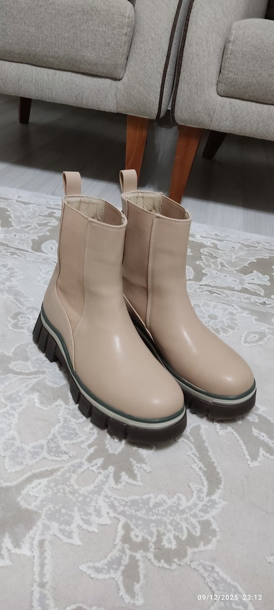 Bej renkli, blok topuklu, kauçuk malzemeden kadın botları. Düz ve desensiz, rahat ve şık günlük kullanım için uygundur.