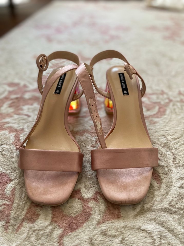 İpeksi kumaşlı, bej blok topuklu gece ayakkabısı, tokalı kayışlarla ve desen içermeyen çağdaş tasarımla. Romantik akşamlar için uygun.