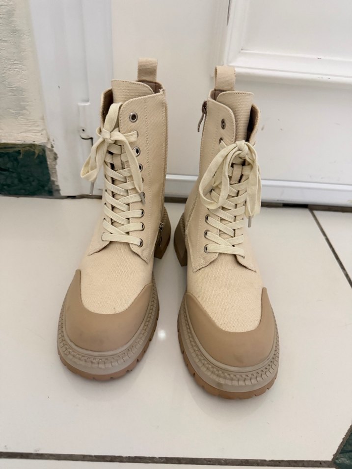 Bej renk blok topuklu kadın botları, minimal ve normcore tasarımla. Dayanıklı kauçuk malzeme, günlük kullanım için zahmetsiz şıklık sunar.