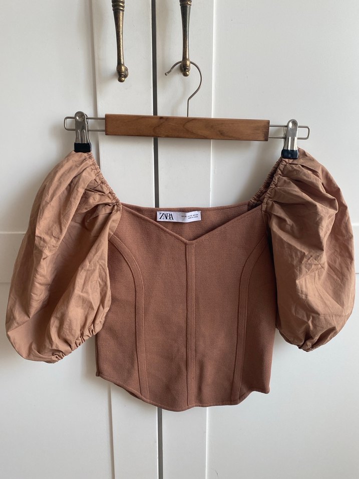 Bej renkli, keten kumaştan, straplez yakalı ve hacimli kollu, düğmeli, midi uzunlukta kadın bluz. Günlük sokak stili için uygun. 34 uyumlu korse tarz.