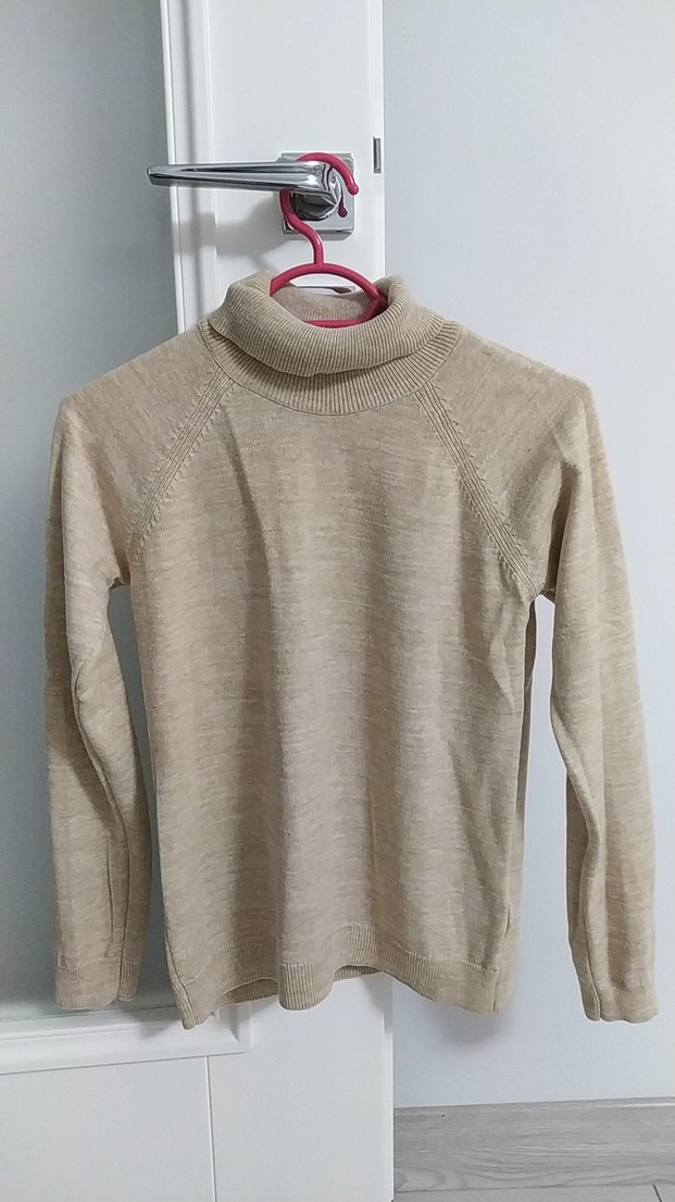 Bej renkli, boğazlı ve uzun kollu, yumuşak yün kumaştan yapılmış kadın fitted triko kazak. Örgü dokusu ve normal midi boyu ile günlük kullanıma uygundur.