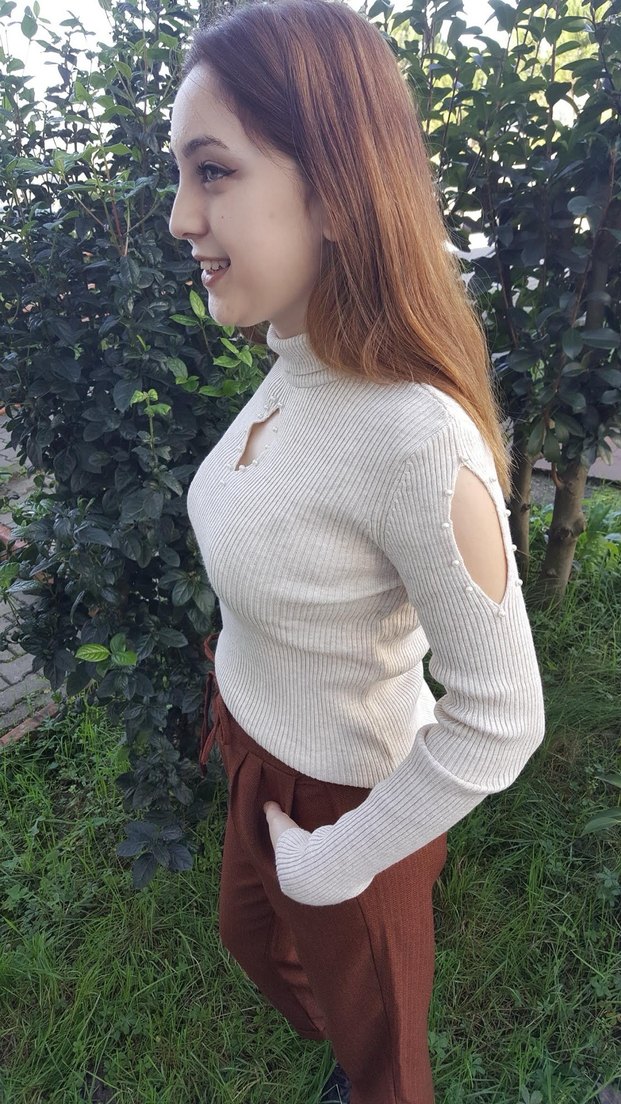 Bej renkli, boğazlı ve uzun kollu, omuz ve göğüs kısmında kesik detaylara sahip kısa triko kazak. Yumuşak örgü kumaştan, günlük sokak stili için uygun.