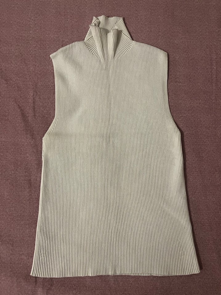 Bej renkli, boğazlı ve kolsuz,yan yuvarlak dekolte fit kesim triko crop. Yumuşak dokulu ve minimalist sokak stili sunar.