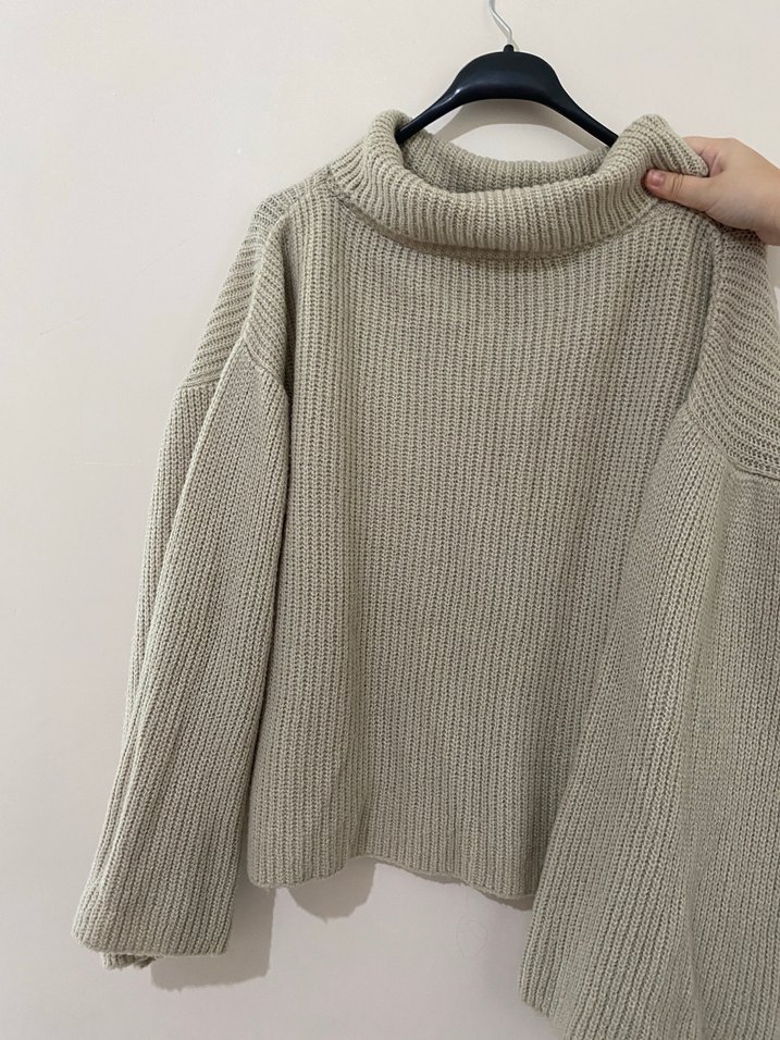 Bej renkli, örgü dokulu boğazlı kazak, bol kesim ve uzun kollu, rahat günlük kullanım için uygundur. Lekesi çıkar mı bilmiyorum denemedim. İade kabul etmiyorum.