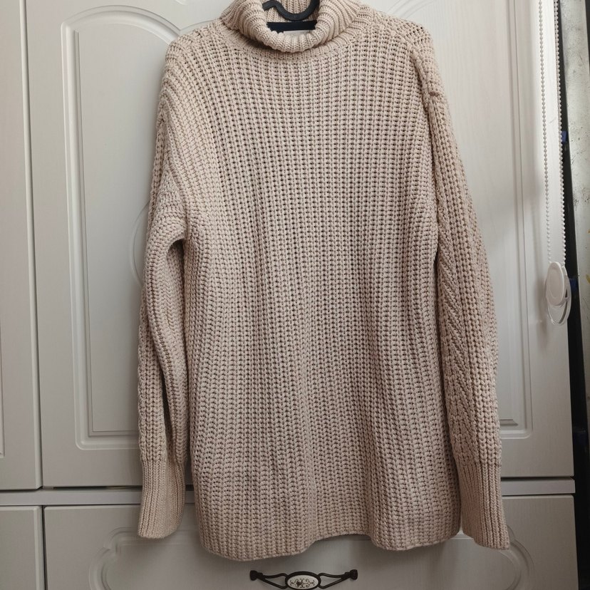 Bej renkte, boğazlı ve uzun kollu örgü kadın triko kazak. Rahat kesimi ve normal boyuyla gündelik kullanıma uygundur.