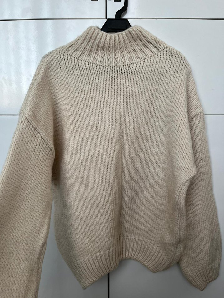 Bej renkli, boğazlı, uzun kollu, örme kadın kazak. Rahat ve midi boy, gündelik kullanıma uygun sade ve temel tarzda. Hiçbir sorunu yoktur yeni ürün hiç giyilmedi S beden ama M ve L bedene uyar.