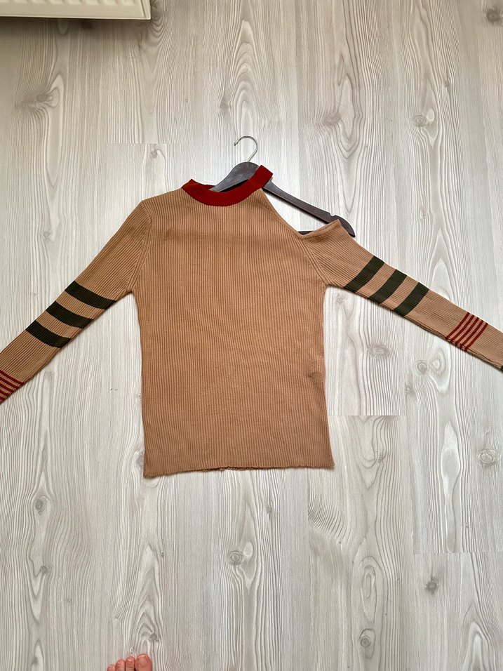 Bej renkli, boğazlı ve uzun kollu, çizgili kollara sahip, kısa kesim ve ince dokulu kadın triko kazak.