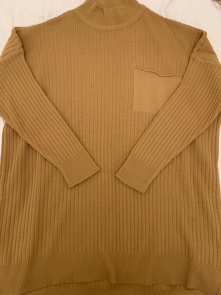 Bej renkli, boğazlı, uzun kollu ve triko örme kadın kazak. Cep detayı ve rahat kesimiyle günlük kullanıma uygundur.