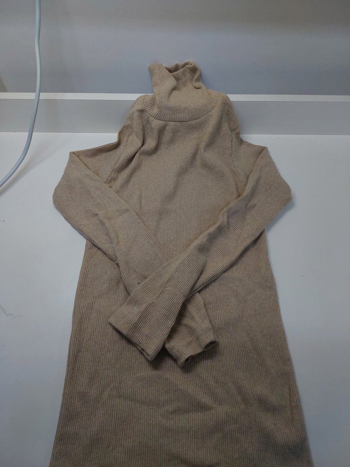 Bej renkli, boğazlı ve uzun kollu kadın triko kazak.sade ve düz desensiz, günlük kullanım için uygun.