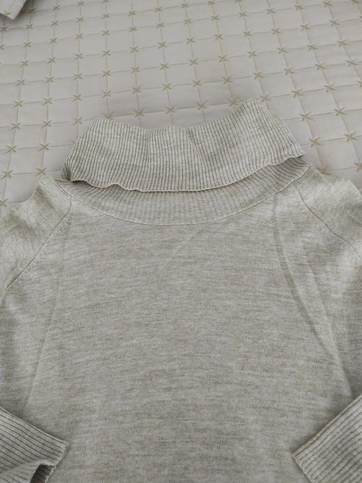 Bej renkli, boğazlı ve ince triko dokusuna sahip kadın kazak. Uzun kollu, vücuda oturan ve günlük kullanıma uygun.