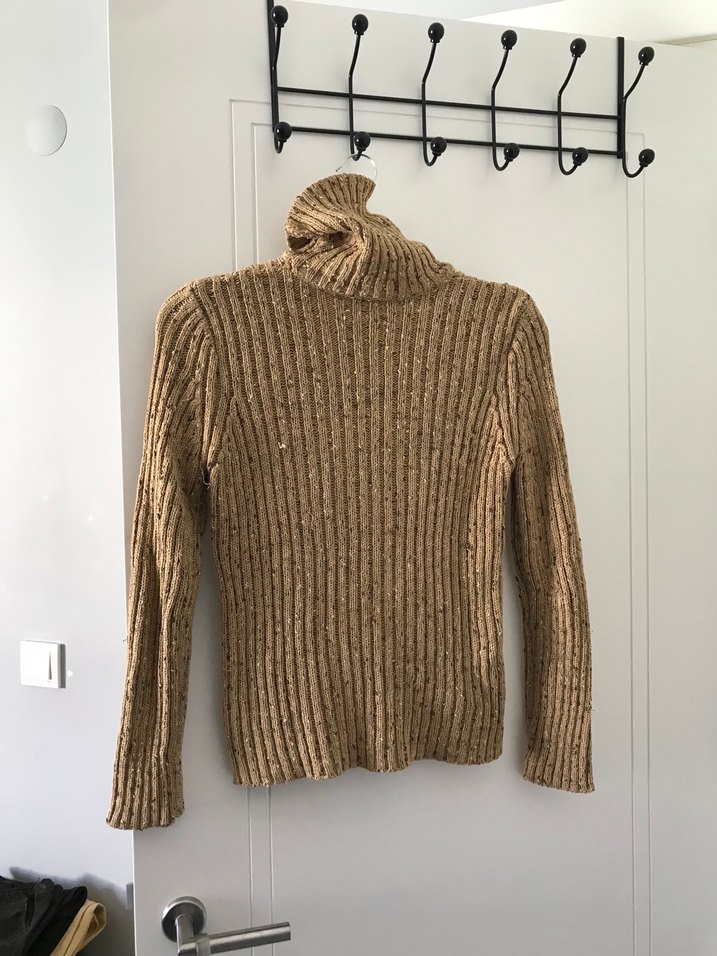 Bej renkte, boğazlı ve uzun kollu, vücuda oturan fitilli triko kazak. Yumuşak örgü kumaştan, günlük kullanıma uygun rahat bir parça.