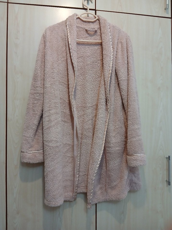 Bej renkli, uzun kollu ve bol kesim kadın bornozudur. Yumuşak, rahat kumaştan yapılmış olup bohem tarzındadır ve midi boydadır. Desensizdir.
